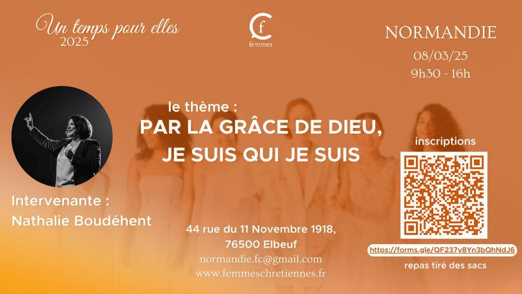 News Journée femmes chrétiennes par Pasteur Frédéric Debrée|Publié 21 février 2025 Voici également une excellente journée en perspective pour les femmes. Dieu à déjà béni cette journée. Inscription auprès de Fanny.